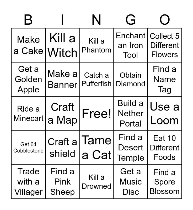 This bingo card has a free space and 24 words: Craft a shield, Find a Pink Sheep, Catch a Pufferfish, Trade with a Villager, Collect 5 Different Flowers, Make a Cake, Get a Golden Apple, Kill a Witch, Build a Nether Portal, Tame a Cat, Obtain Diamond, Ride a Minecart, Find a Desert Temple, Eat 10 Different Foods, Make a Banner, Get a Music Disc, Use a Loom, Kill a Phantom, Find a Name Tag, Craft a Map, Find a Spore Blossom, Get 64 Cobblestone, Enchant an Iron Tool and Kill a Drowned.