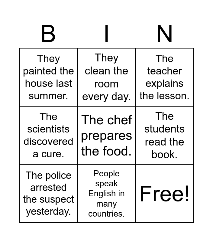 This bingo card has 12 words: The chef, Free!, The chef prepares the food., The students read the book., They clean the room every day., The teacher explains the lesson., People speak English in many countries., The company launched a new product., They painted the house last summer., The scientists discovered a cure., The police arrested the suspect yesterday. and The manager approved the project last week..