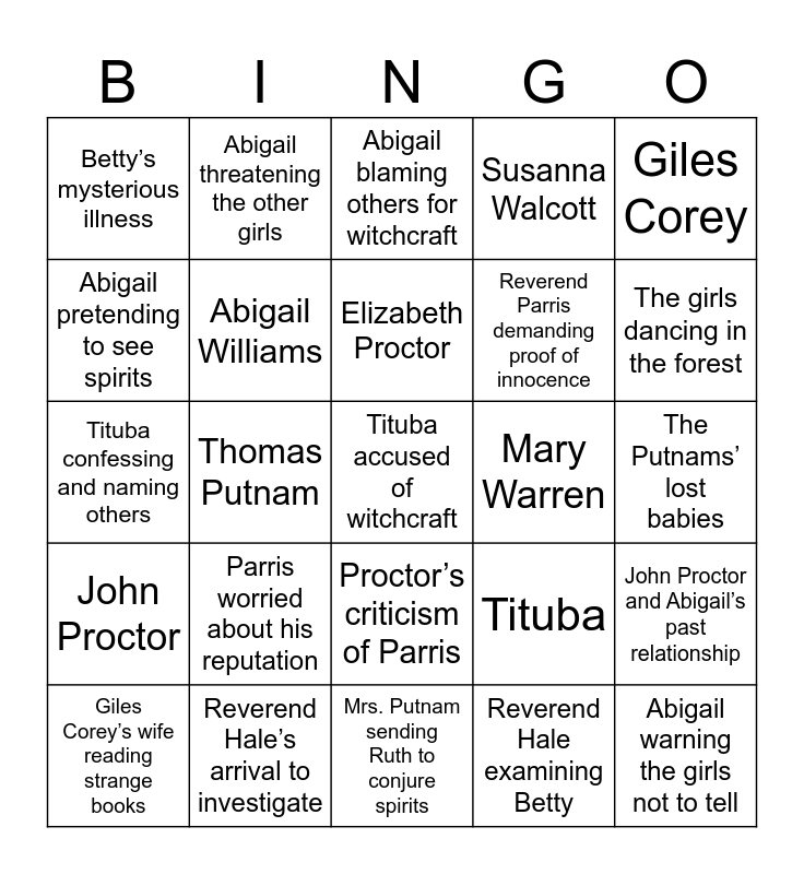 This bingo card has 36 words: Free!, Reverend Parris, Betty Parris, Abigail Williams, Tituba, John Proctor, Elizabeth Proctor, Reverend Hale, Giles Corey, Mrs. Putnam, Thomas Putnam, Susanna Walcott, Mercy Lewis, Mary Warren, The girls dancing in the forest, Betty’s mysterious illness, Abigail warning the girls not to tell, Parris worried about his reputation, Tituba accused of witchcraft, Abigail blaming others for witchcraft, The Putnams’ lost babies, John Proctor and Abigail’s past relationship, Reverend Hale’s arrival to investigate, Giles Corey’s wife reading strange books, Mrs. Putnam sending Ruth to conjure spirits, Abigail threatening the other girls, Tituba confessing and naming others, The argument over land between Putnams and Nurses, Reverend Parris demanding proof of innocence, Abigail pretending to see spirits, Mary Warren’s role in the group, The girls’ hysteria during questioning, Reverend Hale examining Betty, Proctor’s criticism of Parris, Abigail’s desire to kill Elizabeth Proctor and Reverend Parris discovering the girls dancing in the forest.