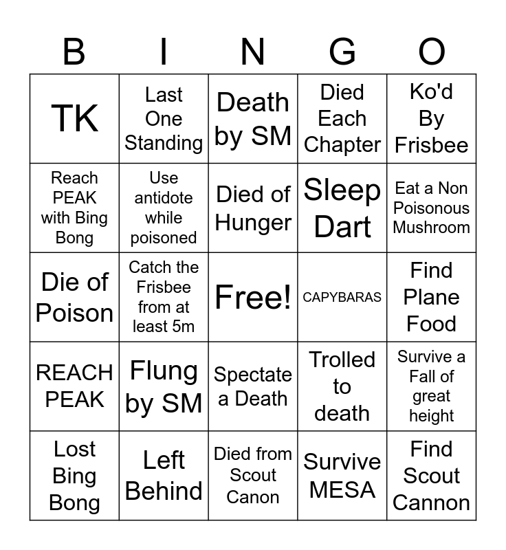 This bingo card has a free space and 24 words: Flung by SM, Left Behind, Died of Hunger, Lost Bing Bong, Ko'd By Frisbee, TK, Reach PEAK with Bing Bong, Last One Standing, CAPYBARAS, Spectate a Death, Sleep Dart, Die of Poison, Trolled to death, Survive a Fall of great height, Use antidote while poisoned, Survive MESA, Find Plane Food, Death by SM, Eat a Non Poisonous Mushroom, Catch the Frisbee from at least 5m, Find Scout Cannon, REACH PEAK, Died Each Chapter and Died from Scout Canon.