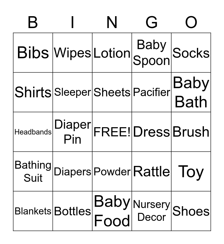 This bingo card has a free space and 24 words: Diapers, Bottles, Sheets, Blankets, Socks, Bibs, Shirts, Wipes, Dress, Powder, Pacifier, Headbands, Rattle, Toy, Sleeper, Nursery Decor, Brush, Lotion, Baby Bath, Diaper Pin, Shoes, Bathing Suit, Baby Spoon and Baby Food.