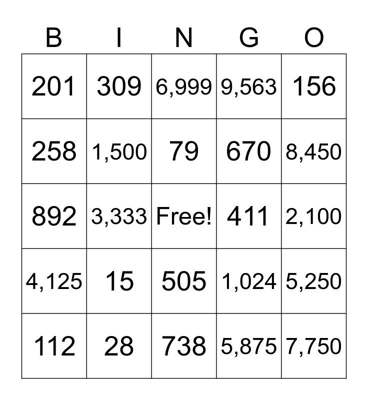 This bingo card has a free space and 24 words: 15, 28, 79, 112, 156, 201, 258, 309, 411, 505, 670, 892, 1,024, 5,250, 1,500, 5,875, 2,100, 6,999, 8,450, 3,333, 7,750, 4,125, 9,563 and 738.