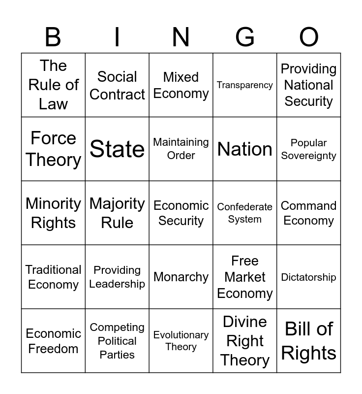 This bingo card has a free space and 24 words: Providing Leadership, Competing Political Parties, Maintaining Order, Economic Freedom, Providing National Security, The Rule of Law, Force Theory, Social Contract, Confederate System, Monarchy, Nation, Minority Rights, Free Market Economy, Dictatorship, State, Divine Right Theory, Command Economy, Mixed Economy, Popular Sovereignty, Majority Rule, Bill of Rights, Traditional Economy, Transparency and Evolutionary Theory.