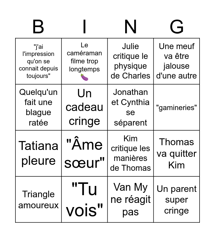 This bingo card has 16 words: "Tu vois", Thomas va quitter Kim, Julie critique le physique de Charles, "j'ai l'impression qu'on se connait depuis toujours", Tatiana pleure, Le caméraman filme trop longtemps 🍆, Kim critique les manières de Thomas, Van My ne réagit pas, Quelqu'un fait une blague ratée, Un cadeau cringe, Triangle amoureux, Une meuf va être jalouse d'une autre, "Âme sœur", "gamineries", Jonathan et Cynthia se séparent and Un parent super cringe.