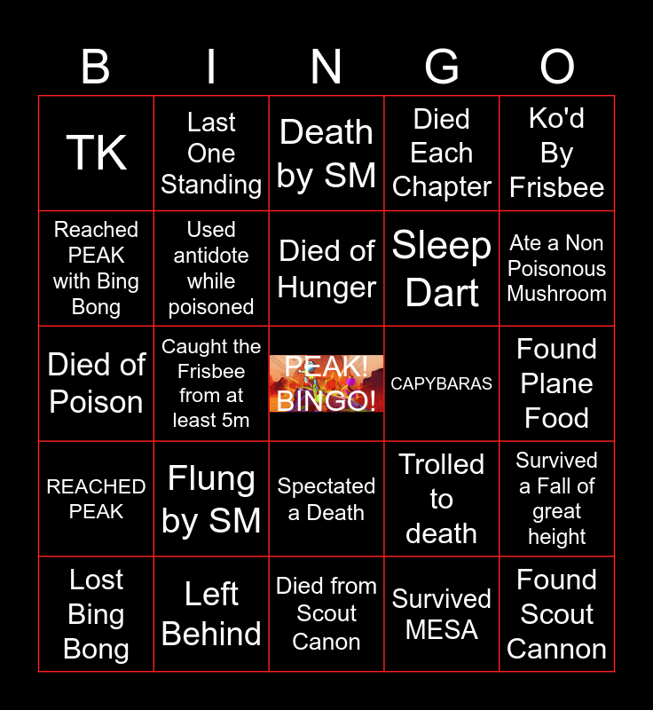 This bingo card has a free space and 24 words: Flung by SM, Left Behind, Died of Hunger, Lost Bing Bong, Ko'd By Frisbee, TK, Reached PEAK with Bing Bong, Last One Standing, CAPYBARAS, Spectated a Death, Sleep Dart, Died of Poison, Trolled to death, Survived a Fall of great height, Used antidote while poisoned, Survived MESA, Found Plane Food, Death by SM, Ate a Non Poisonous Mushroom, Caught the Frisbee from at least 5m, Found Scout Cannon, REACHED PEAK, Died Each Chapter and Died from Scout Canon.