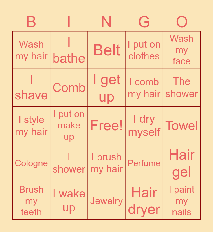 This bingo card has a free space and 24 words: I shower, I wake up, I get up, Brush my teeth, Wash my face, Wash my hair, I shave, I bathe, I dry myself, I brush my hair, I comb my hair, I style my hair, Perfume, Hair gel, Comb, Hair dryer, Towel, Belt, The shower, I put on make up, I paint my nails, Cologne, I put on clothes and Jewelry.