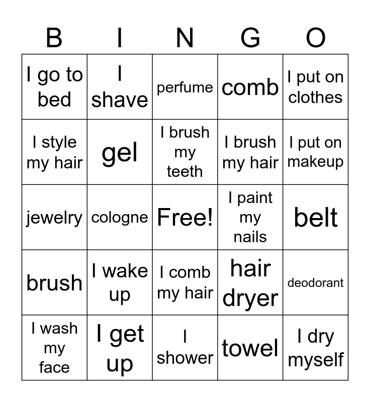 This bingo card has a free space and 24 words: I wake up, I get up, I brush my teeth, I wash my face, I put on clothes, I go to bed, I style my hair, I shave, I paint my nails, I comb my hair, I brush my hair, jewelry, hair dryer, deodorant, gel, towel, belt, perfume, I put on makeup, cologne, I dry myself, brush, comb and I shower.
