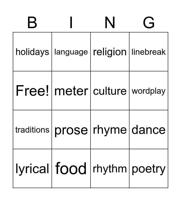 This bingo card has 16 words: food, dance, religion, holidays, traditions, language, rhyme, rhythm, Free!, meter, lyrical, linebreak, prose, wordplay, culture and poetry.