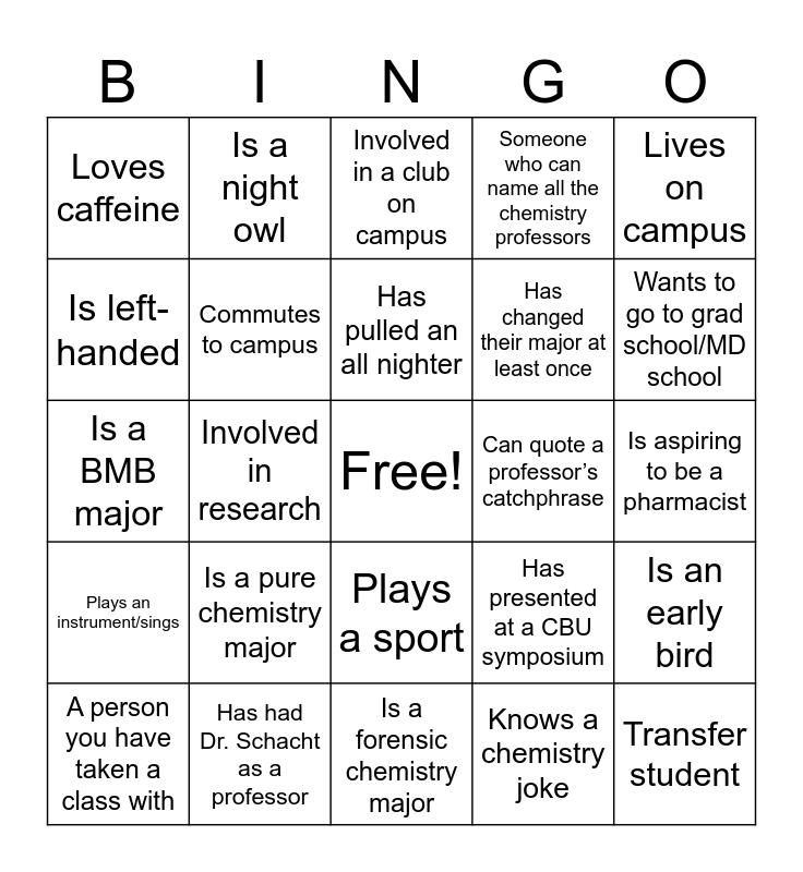 This bingo card has a free space and 24 words: Is a pure chemistry major, Has had Dr. Schacht as a professor, Has pulled an all nighter, A person you have taken a class with, Lives on campus, Loves caffeine, Is left-handed, Is a night owl, Can quote a professor’s catchphrase, Plays a sport, Has changed their major at least once, Is a BMB major, Has presented at a CBU symposium, Is an early bird, Commutes to campus, Knows a chemistry joke, Is aspiring to be a pharmacist, Involved in a club on campus, Wants to go to grad school/MD school, Involved in research, Transfer student, Plays an instrument/sings, Someone who can name all the chemistry professors and Is a forensic chemistry major.