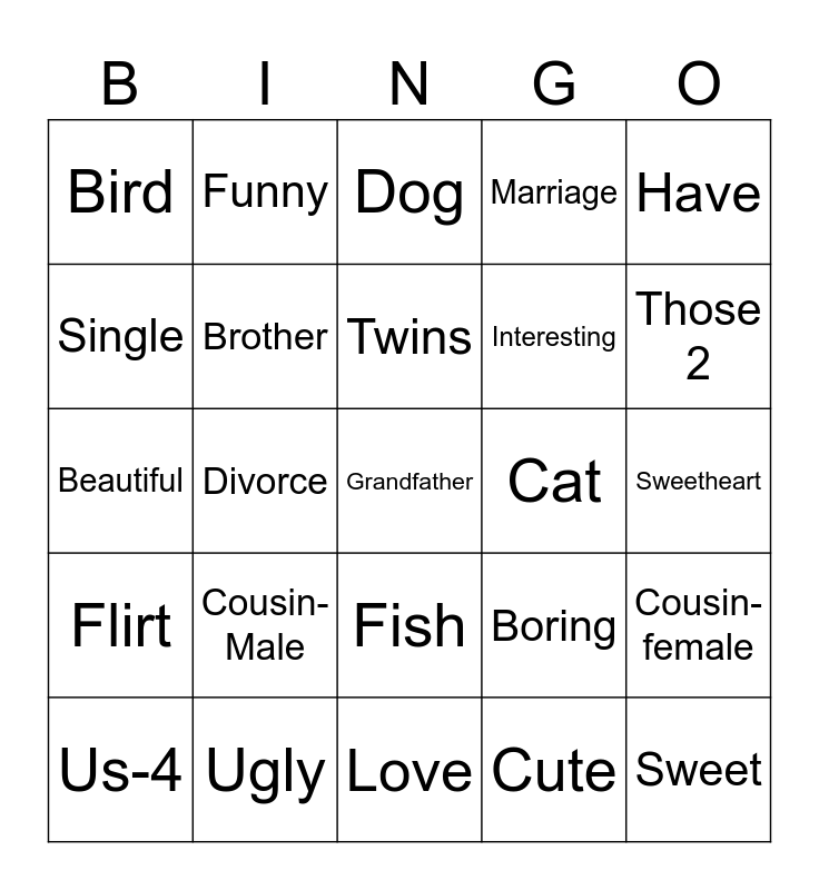 This bingo card has 37 words: Free!, Dead, Sister, Brother, Cousin-female, Cousin- Male, Twins, Family, Have, Uncle, Divorce, Marriage, Grandfather, Sweetheart, Single, Flirt, Dating, Dog, Fish, Cat, Bird, Those 2, Us-4, Love, College, Cute, Funny, Shy, Lazy, Smart, Stupid, Ugly, Beautiful, Sweet, Boring, Interesting and Mischievous.