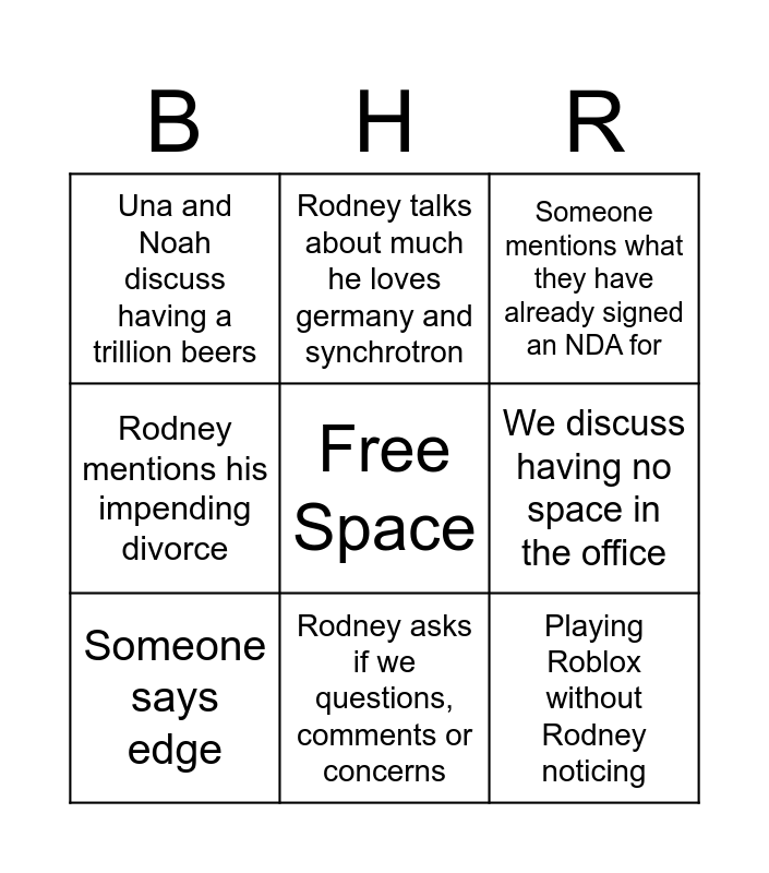 This bingo card has a free space and 8 words: We discuss having no space in the office, Someone mentions what they have already signed an NDA for, Rodney talks about much he loves germany and synchrotron, Someone says edge, Una and Noah discuss having a trillion beers, Playing Roblox without Rodney noticing, Rodney mentions his impending divorce and Rodney asks if we questions, comments or concerns.