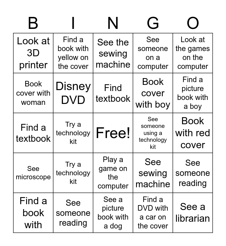 This bingo card has a free space and 45 words: Look at the 3D printer, See a librarian, Find a book with red on the cover, Find a book with, Find a book with over 200 pages, Find a DVD with a car on the cover, See the sewing machine, See the microscope, Look at the games on the computer, See someone reading, See someone on a computer, See someone using a technology kit, Play a game on the computer, Try a technology kit, Say hi to someone you don't know, See a picture book with a dog, See a printer, Find a textbook, Find a book with a woman on the cover, Find a picture book with a boy, Find a book with yellow on the cover, Find a DVD for a Disney movie, Find a DVD with green on the cover, Look at 3D printer, See librarian, Book with red cover, Book over 100 pages, DVD with a car, See sewing machine, See microscope, Look at computer games, See someone reading, See someone on a computer, See someone using a kit, Play a computer game, Try a technology kit, Say hi to a new person, Book with a dog, See printer, Find textbook, Book cover with woman, Book cover with boy, Book with yellow cover, Disney DVD and DVD with green cover.