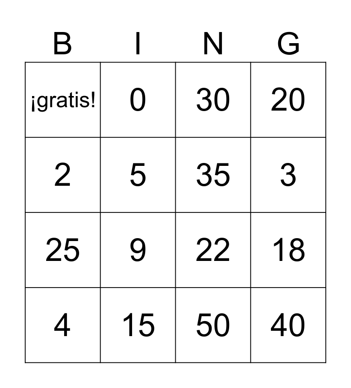 This bingo card has 16 words: 4, 15, 30, 20, 2, 0, 22, 18, ¡gratis!, 5, 50, 3, 25, 9, 35 and 40.