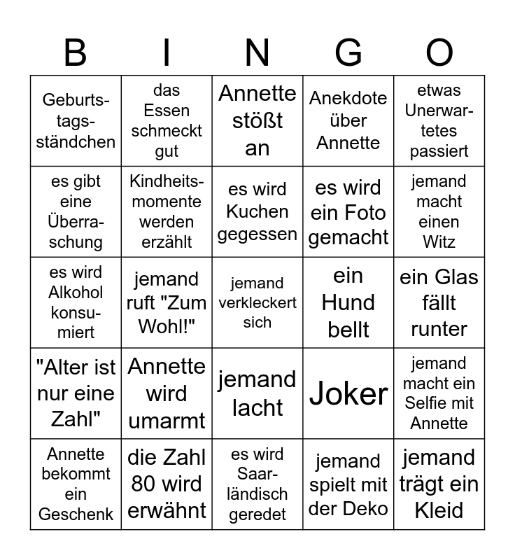 This bingo card has 25 words: Annette wird umarmt, es wird Saar-ländisch geredet, es wird Kuchen gegessen, Annette bekommt ein Geschenk, etwas Unerwar-tetes passiert, Geburts-tags-ständchen, es gibt eine Überra-schung, das Essen schmeckt gut, ein Hund bellt, jemand lacht, es wird ein Foto gemacht, es wird Alkohol konsu-miert, Joker, jemand macht ein Selfie mit Annette, Kindheits-momente werden erzählt, jemand trägt ein Kleid, ein Glas fällt runter, Annette stößt an, jemand macht einen Witz, jemand ruft "Zum Wohl!", jemand verkleckert sich, die Zahl 80 wird erwähnt, "Alter ist nur eine Zahl", Anekdote über Annette and jemand spielt mit der Deko.