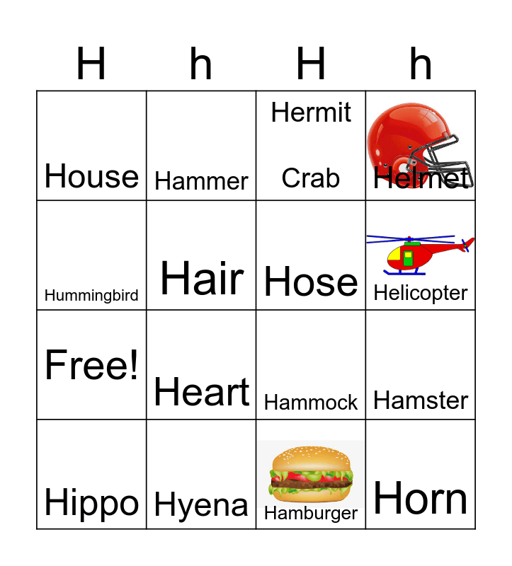 This bingo card has 4 images and 20 words: Hamster, Hawk, Hermit Crab, Horse, Hippo, Hummingbird, Hyena, House, Free!, Hammer, Heart, Hammock, Hair, Horn, Hose, Hat, Helicopter, Helmet, Hamburger and Hot Dog.