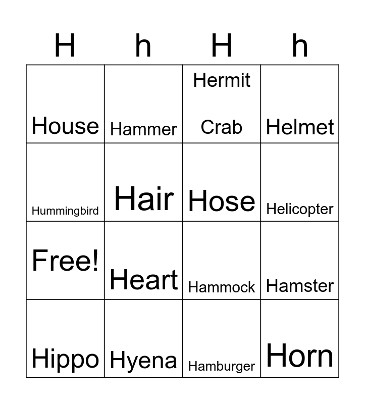 This bingo card has 20 words: Hamster, Hawk, Hermit Crab, Horse, Hippo, Hummingbird, Hyena, House, Free!, Hammer, Heart, Hammock, Hair, Horn, Hose, Hat, Helicopter, Helmet, Hamburger and Hot Dog.