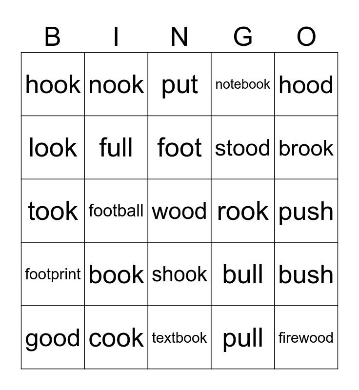 This bingo card has a free space and 24 words: book, cook, foot, good, hood, hook, look, nook, rook, shook, stood, took, bull, bush, full, pull, push, put, brook, football, firewood, footprint, notebook and textbook.