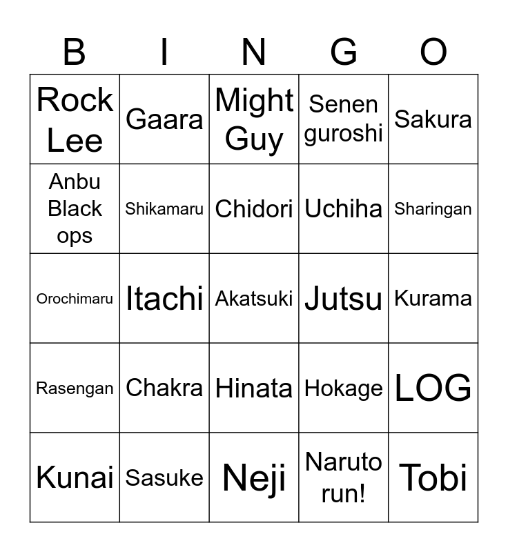 This bingo card has 30 words: Sasuke, Naruto, Itachi, Kakashi, Rock Lee, Might Guy, Shikamaru, Hinata, Jutsu, Neji, Kurama, Akatsuki, Naruto run!, Tobi, Sharingan, Jiraiya, Hokage, Rasengan, Chakra, Sakura, Orochimaru, Lady Tsunade, Gaara, Uchiha, Anbu Black ops, Senen guroshi, LOG, Kunai, Chidori and Hand signs.