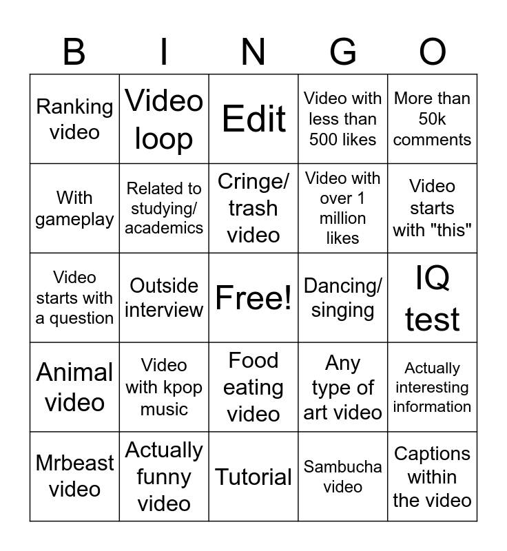 This bingo card has a free space and 24 words: Video with kpop music, Actually funny video, Cringe/ trash video, Mrbeast video, More than 50k comments, Ranking video, With gameplay, Video loop, Dancing/ singing, Food eating video, Video with over 1 million likes, Video starts with a question, Any type of art video, Actually interesting information, Related to studying/ academics, Sambucha video, IQ test, Edit, Video starts with "this", Outside interview, Captions within the video, Animal video, Video with less than 500 likes and Tutorial.