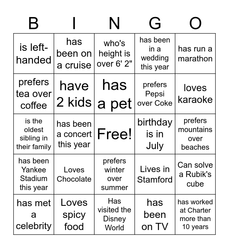 This bingo card has a free space and 24 words: Loves Chocolate, Loves spicy food, has a pet, has met a celebrity, has run a marathon, is left-handed, prefers tea over coffee, has been on a cruise, birthday is in July, prefers winter over summer, prefers Pepsi over Coke, is the oldest sibling in their family, Lives in Stamford, Can solve a Rubik's cube, have 2 kids, has been on TV, prefers mountains over beaches, who's height is over 6' 2", loves karaoke, has been a concert this year, has worked at Charter more than 10 years, has been Yankee Stadium this year, has been in a wedding this year and Has visited the Disney World.
