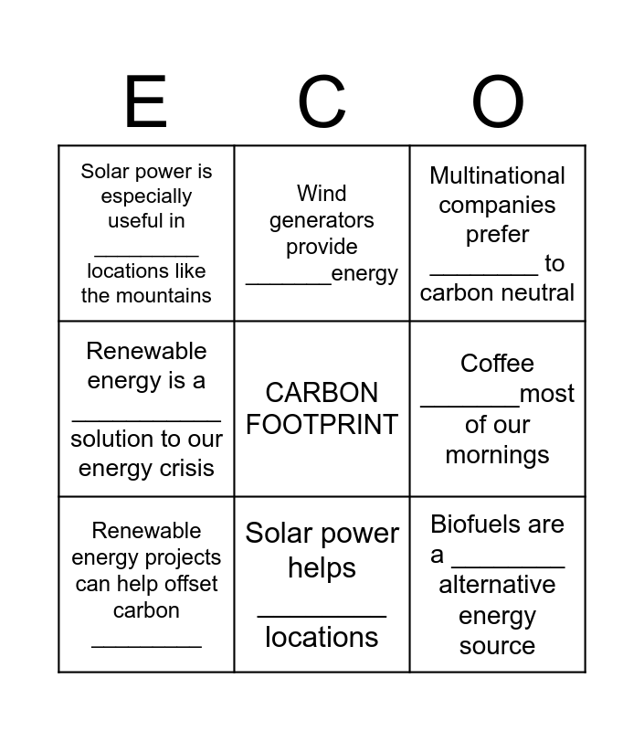 This bingo card has a free space and 12 words: _____ generate enough energy to charge batteries, Coffee grounds can be recycled into _______, Biofuels are a ________ alternative energy source, Coffee _______most of our mornings, Wind generators provide _______energy, Multinational companies prefer ________ to carbon neutral, Solar power helps ________ locations, Solar panels make _________energy, Solar power is especially useful in _________ locations like the mountains, Renewable energy is a ___________ solution to our energy crisis, Renewable energy projects can help offset carbon _________ and Balancing ones carbon emission and production is ____________.