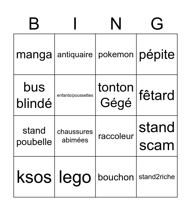 This bingo card has 16 words: lego, stand scam, pokemon, manga, stand poubelle, antiquaire, raccoleur, bouchon, bus blindé, enfants/poussettes, ksos, pépite, chaussures abimées, fêtard, tonton Gégé and stand2riche.