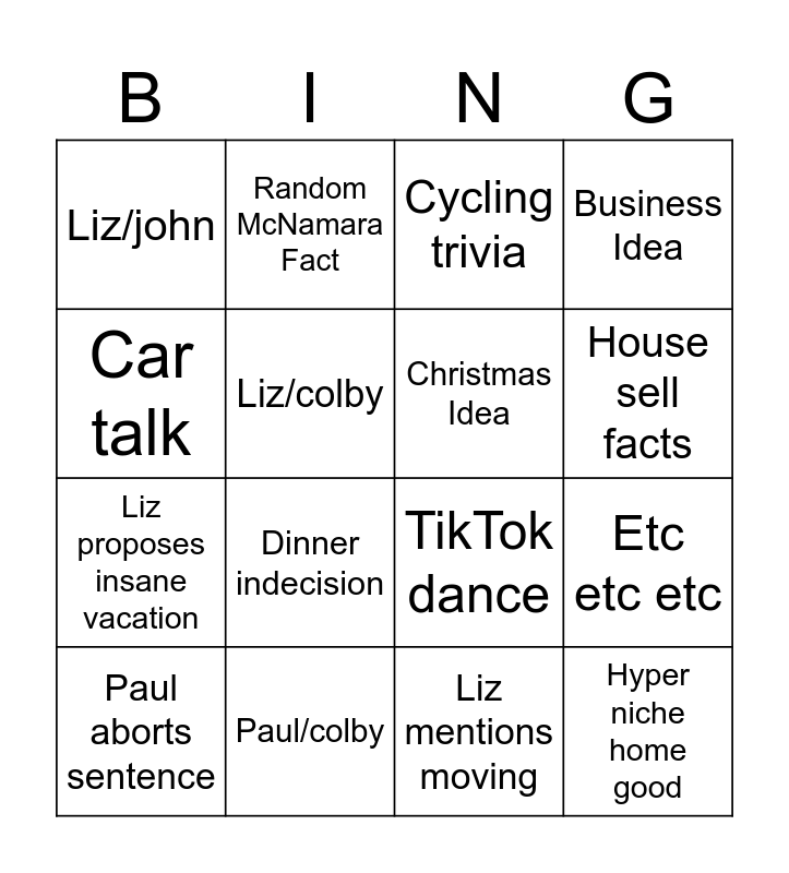 This bingo card has 16 words: Paul/colby, Etc etc etc, Cycling trivia, Liz/john, Liz proposes insane vacation, Random McNamara Fact, TikTok dance, Liz mentions moving, Car talk, Liz/colby, Paul aborts sentence, Business Idea, Dinner indecision, House sell facts, Christmas Idea and Hyper niche home good.