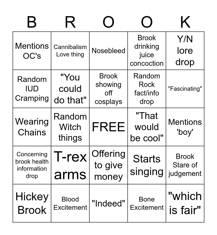 This bingo card has a free space and 24 words: T-rex arms, Blood Excitement, Brook showing off cosplays, Hickey Brook, Y/N lore drop, Mentions OC's, Random IUD Cramping, Cannibalism Love thing, "That would be cool", Offering to give money, Random Rock fact/info drop, Wearing Chains, Starts singing, Brook Stare of judgement, "You could do that", Bone Excitement, Mentions 'boy', Nosebleed, "Fascinating", Random Witch things, "which is fair", Concerning brook health information drop, Brook drinking juice concoction and "Indeed".