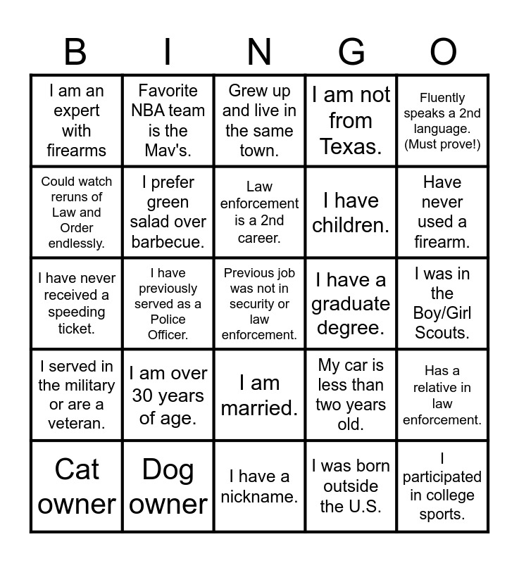 This bingo card has a free space and 24 words: I am over 30 years of age., Dog owner, Law enforcement is a 2nd career., Cat owner, Fluently speaks a 2nd language. (Must prove!), I am an expert with firearms, Could watch reruns of Law and Order endlessly., Favorite NBA team is the Mav's., I have a graduate degree., I am married., I have children., I have never received a speeding ticket., My car is less than two years old., Has a relative in law enforcement., I prefer green salad over barbecue., I was born outside the U.S., I was in the Boy/Girl Scouts., Grew up and live in the same town., Have never used a firearm., I have previously served as a Police Officer., I participated in college sports., I served in the military or are a veteran., I am not from Texas. and I have a nickname..