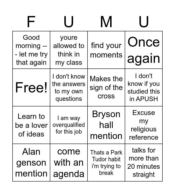 This bingo card has 16 words: come with an agenda, Excuse my religious reference, find your moments, Good morning --- let me try that again, Learn to be a lover of ideas, youre allowed to think in my class, Bryson hall mention, Thats a Park Tudor habit i'm trying to break, Free!, I don't know the answers to my own questions, Alan genson mention, Once again, I am way overqualified for this job, I don't know if you studied this in APUSH, Makes the sign of the cross and talks for more than 20 minutes straight.