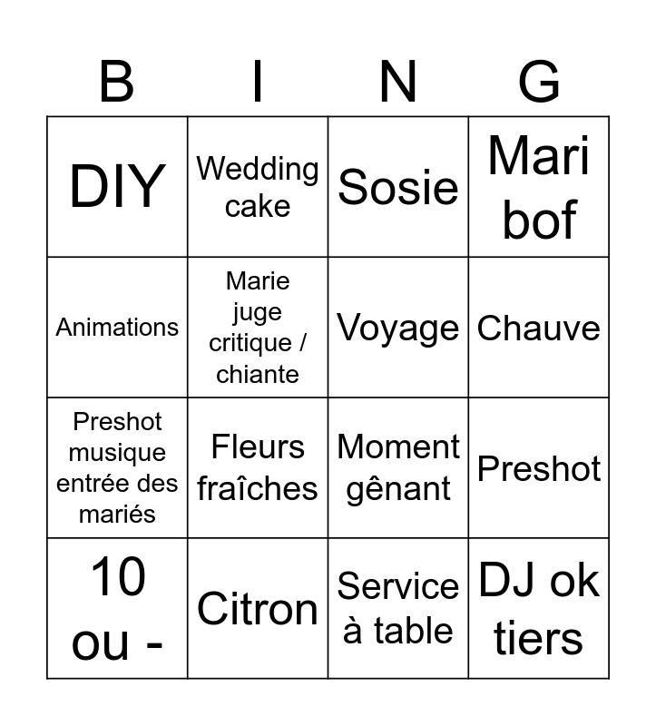 This bingo card has 16 words: Citron, Preshot, Sosie, DIY, Preshot musique entrée des mariés, Wedding cake, Moment gênant, Service à table, Animations, Marie juge critique / chiante, 10 ou -, Mari bof, Fleurs fraîches, Chauve, Voyage and DJ ok tiers.