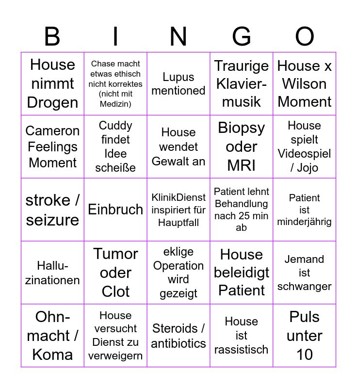This bingo card has 32 words: House ist rassistisch, House ist sexistisch / sexualisierend, Einbruch, Jemand weint, Hallu-zinationen, Cuddy findet Idee scheiße, House x Wilson Moment, Jemand ist schwanger, Chase macht etwas ethisch nicht korrektes (nicht mit Medizin), Puls unter 10, House wendet Gewalt an, Lupus mentioned, erst aus-geschlossen, dann doch die Krankheit, cameron brille, Patient lehnt Behandlung nach 25 min ab, Patient / Angehöriger lügt, Ohn- macht / Koma, stroke / seizure, eklige Operation wird gezeigt, Tumor oder Clot, House beleidigt Patient, Patient fühlt nichts / gelähmt, Patient ist minderjährig, House versucht Dienst zu verweigern, KlinikDienst inspiriert für Hauptfall, Traurige Klavier-musik, Biopsy oder MRI, Cameron Feelings Moment, House nimmt Drogen, Steroids / antibiotics, Blut and House spielt Videospiel / Jojo.
