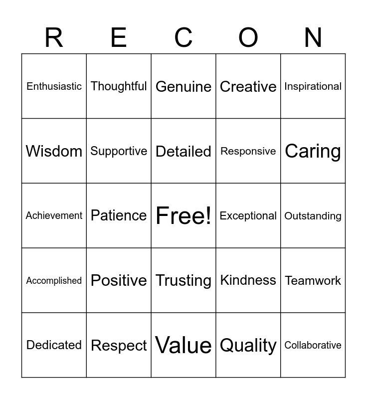 This bingo card has a free space and 24 words: Dedicated, Positive, Detailed, Quality, Inspirational, Enthusiastic, Thoughtful, Genuine, Exceptional, Outstanding, Achievement, Supportive, Kindness, Teamwork, Wisdom, Respect, Value, Creative, Caring, Accomplished, Patience, Trusting, Responsive and Collaborative.