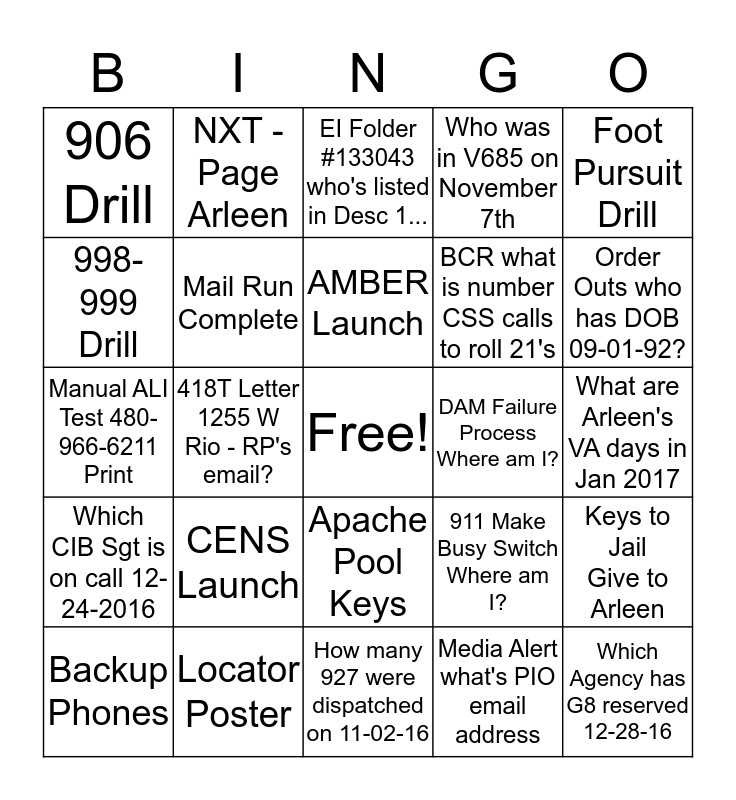 This bingo card has a free space and 24 words: CENS Launch, Locator Poster, AMBER Launch, Backup Phones, Foot Pursuit Drill, 906 Drill, 998-999 Drill, NXT - Page Arleen, DAM Failure Process Where am I?, Apache Pool Keys, BCR what is number CSS calls to roll 21's, Manual ALI Test 480-966-6211 Print, 911 Make Busy Switch Where am I?, Keys to Jail Give to Arleen, Mail Run Complete, Media Alert what's PIO email address, What are Arleen's VA days in Jan 2017, EI Folder #133043 who's listed in Desc 1..., Order Outs who has DOB 09-01-92?, 418T Letter 1255 W Rio - RP's email?, Which Agency has G8 reserved 12-28-16, Which CIB Sgt is on call 12-24-2016, Who was in V685 on November 7th and How many 927 were dispatched on 11-02-16.