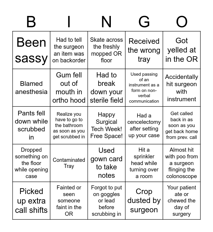 This bingo card has a free space and 24 words: Contaminated Tray, Fainted or seen someone faint in the OR, Had to break down your sterile field, Picked up extra call shifts, Got yelled at in the OR, Been sassy, Blamed anesthesia, Had to tell the surgeon an item was on backorder, Had a cencelectomy after setting up your case, Used gown card to take notes, Used passing of an instrument as a form on non-verbal communication, Pants fell down while scrubbed in, Hit a sprinkler head while turning over a room, Almost hit with poo from a surgeon flinging the colonoscope, Gum fell out of mouth in ortho hood, Crop dusted by surgeon, Get called back in as soon as you get back home from prev. call, Skate across the freshly mopped OR floor, Accidentally hit surgeon with instrument, Realize you have to go to the bathroom as soon as you get scrubbed in, Your patient ate or chewed the day of surgery, Dropped something on the floor while opening case, Received the wrong tray and Forgot to put on goggles or lead before scrubbing in.