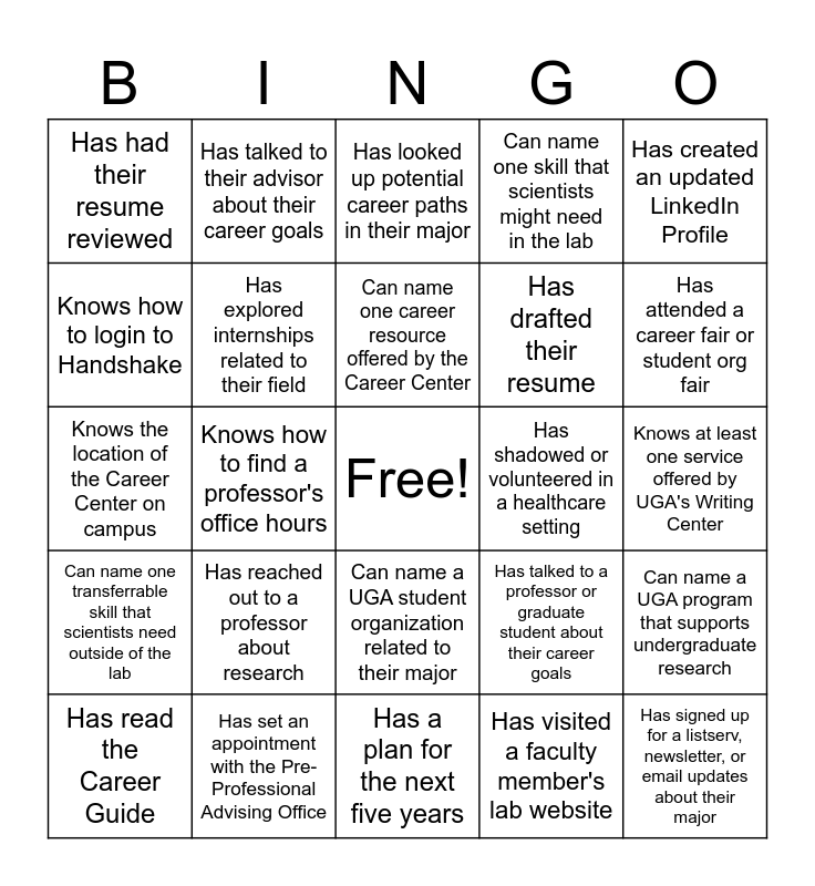 This bingo card has a free space and 24 words: Has reached out to a professor about research, Has set an appointment with the Pre-Professional Advising Office, Can name one career resource offered by the Career Center, Has read the Career Guide, Has created an updated LinkedIn Profile, Has had their resume reviewed, Knows how to login to Handshake, Has talked to their advisor about their career goals, Has shadowed or volunteered in a healthcare setting, Can name a UGA student organization related to their major, Has drafted their resume, Knows the location of the Career Center on campus, Has talked to a professor or graduate student about their career goals, Can name a UGA program that supports undergraduate research, Has explored internships related to their field, Has visited a faculty member's lab website, Knows at least one service offered by UGA's Writing Center, Has looked up potential career paths in their major, Has attended a career fair or student org fair, Knows how to find a professor's office hours, Has signed up for a listserv, newsletter, or email updates about their major, Can name one transferrable skill that scientists need outside of the lab, Can name one skill that scientists might need in the lab and Has a plan for the next five years.