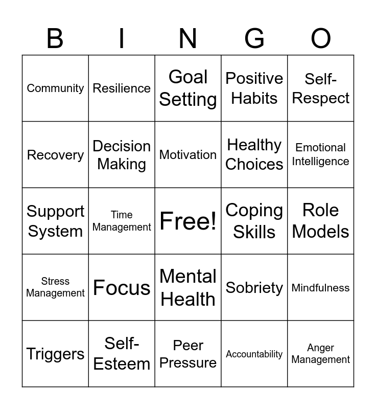 This bingo card has a free space and 27 words: Sobriety, Self-Control, Healthy Choices, Peer Pressure, Recovery, Goal Setting, Resilience, Stress Management, Coping Skills, Mindfulness, Support System, Positive Habits, Triggers, Self-Esteem, Emotional Intelligence, Boundaries, Decision Making, Motivation, Focus, Community, Role Models, Accountability, Time Management, Anger Management, Mental Health, Self-Respect and Healthy Relationships.
