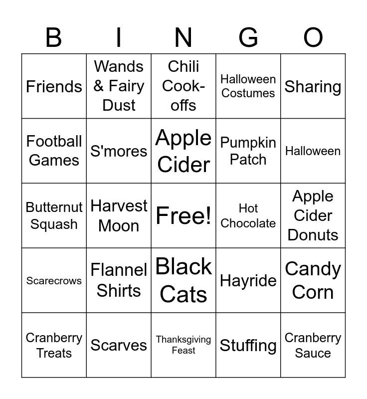 This bingo card has a free space and 88 words: Tree Acorns, Apple Pie, Black Cats, Broomsticks, Whitches Hats, Glowing Candles, Pumpkin Spice, Crunching Leaves, Golden Trees, Scary Masks, PSL Coffees, Roasted Corn, Candy Corn, Apple Cider Donuts, Allspice Cakes, Apple Cider, Roasted Marshmellows, Autumn Colors, Baking Cookies, Bonfires, Caramel Apples, Pear Tarts, Butternut Squash, Soups, Stuffing, Chilly Mornings, Cinnamon, Scary Movies, Treat bags, Costume Contests, Chili Cook-offs, Halloween Costumes, Crisp Air, Falling Leaves, Flannel Shirts, Football Games, Friends, Family, Golden Grasses, Halloween, Harvest Moon, Haunted House, Round Hay Bales, Hayride, Hot Chocolate, Jack-O'-Lantern, Bright Leaves, Misty Mornings, Nutmeg, Pumpkin Patch, Picking Apples, Pumpkin Pie, Piles of Leaves, Pot-Luck Gatherings, Pumpkins, Spider Webs, Scarecrows, Wands & Fairy Dust, Cape'ed Adventurers, Hoodies & Sweatshirts, Ghost Stories, Spooky Boos, Sweater Weather, Cracker Jacks, Pecan Cranberry Pie, Scarves, Cartoon Specials, S'mores, Cranberry Treats, Cranberry Sauce, Tailgate Parties, Cornucopia, Spoken Blessings, Sharing, Laughing, Spooky Tunes, Harvest Festivals, Corn Mazes, Thanksgiving Feast, Cozy Blankets, Wood Smoke, Pinecones, Warm Socks, Sunflower Fields, Autumn Red Leaves, Trick-Or-Treat, Turkey and Gratitudes.