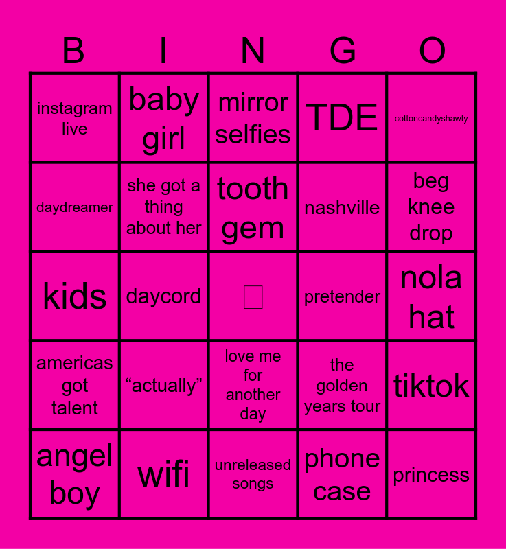 This bingo card has a free space and 39 words: boba, TOP CLASS, worlds best opener, she got a thing about her, angel boy, love me for another day, tooth gem, belt, cottoncandyshawty, americas got talent, daycord, TDE, princess, nola hat, pretender, “actually”, #gameofthronesedit, instagram live, little waves, the golden years tour, daydreamer, unreleased songs, nashville, beg knee drop, brandon squared, 🥀, 🧚, headline tour, underwear, baby girl, tiny tom, music videos, mirror selfies, wifi, phone case, sore throat, tiktok, kids and bad wifi.