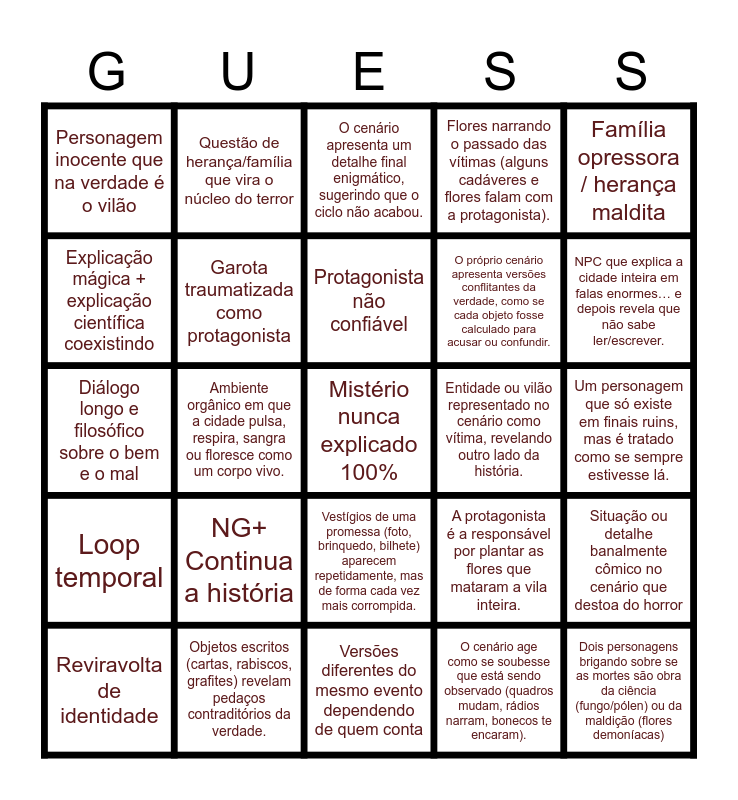This bingo card has 25 words: Loop temporal, Objetos escritos (cartas, rabiscos, grafites) revelam pedaços contraditórios da verdade., Mistério nunca explicado 100%, O cenário age como se soubesse que está sendo observado (quadros mudam, rádios narram, bonecos te encaram)., Família opressora / herança maldita, Personagem inocente que na verdade é o vilão, Questão de herança/família que vira o núcleo do terror, O cenário apresenta um detalhe final enigmático, sugerindo que o ciclo não acabou., Entidade ou vilão representado no cenário como vítima, revelando outro lado da história., Situação ou detalhe banalmente cômico no cenário que destoa do horror, Explicação mágica + explicação científica coexistindo, Garota traumatizada como protagonista, Versões diferentes do mesmo evento dependendo de quem conta, A protagonista é a responsável por plantar as flores que mataram a vila inteira., NPC que explica a cidade inteira em falas enormes… e depois revela que não sabe ler/escrever., Reviravolta de identidade, Ambiente orgânico em que a cidade pulsa, respira, sangra ou floresce como um corpo vivo., Protagonista não confiável, O próprio cenário apresenta versões conflitantes da verdade, como se cada objeto fosse calculado para acusar ou confundir., Um personagem que só existe em finais ruins, mas é tratado como se sempre estivesse lá., Diálogo longo e filosófico sobre o bem e o mal, NG+ Continua a história, Vestígios de uma promessa (foto, brinquedo, bilhete) aparecem repetidamente, mas de forma cada vez mais corrompida., Flores narrando o passado das vítimas (alguns cadáveres e flores falam com a protagonista). and Dois personagens brigando sobre se as mortes são obra da ciência (fungo/pólen) ou da maldição (flores demoníacas).