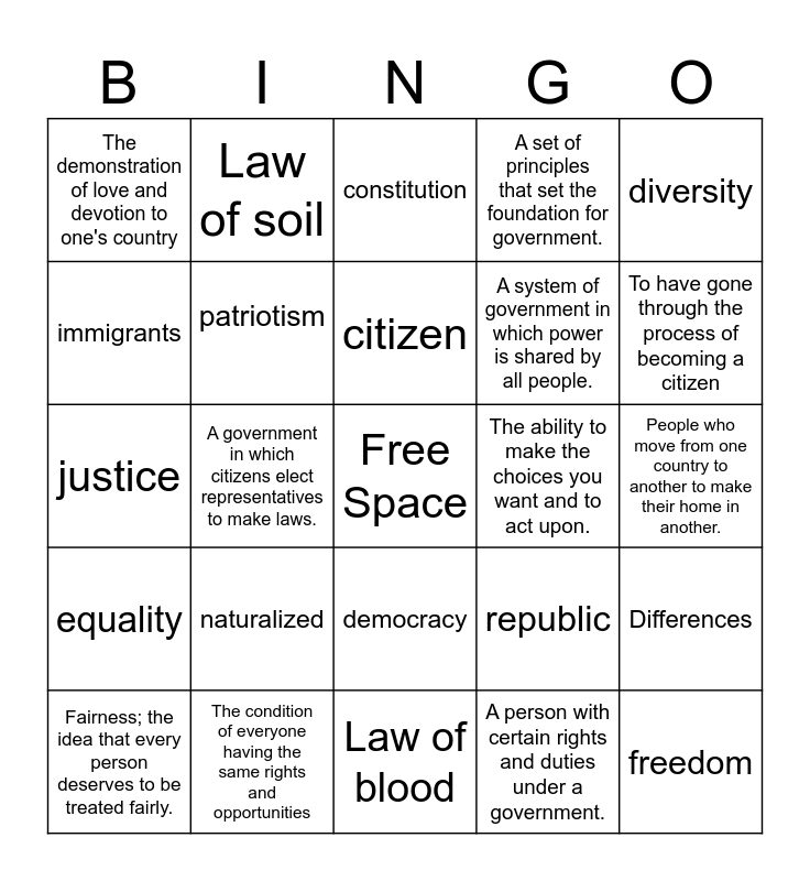 This bingo card has a free space and 24 words: naturalized, The condition of everyone having the same rights and opportunities, citizen, Fairness; the idea that every person deserves to be treated fairly., diversity, The demonstration of love and devotion to one's country, immigrants, Law of soil, The ability to make the choices you want and to act upon., democracy, A system of government in which power is shared by all people., justice, republic, Differences, patriotism, A person with certain rights and duties under a government., People who move from one country to another to make their home in another., constitution, To have gone through the process of becoming a citizen, A government in which citizens elect representatives to make laws., freedom, equality, A set of principles that set the foundation for government. and Law of blood.