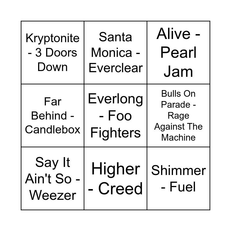 This bingo card has 19 words: I'm Just A Girl - No Doubt, Smells Like Teen Spirit - Nirvana, Alive - Pearl Jam, Black Hole Sun - Soundgarden, Interstate Love Song - Stone Temple Pilots, Everlong - Foo Fighters, Song 2 - Blur, Kryptonite - 3 Doors Down, Santa Monica - Everclear, Shimmer - Fuel, Are You Gonna Go My Way - Lenny Kravitz, Bulls On Parade - Rage Against The Machine, Say It Ain't So - Weezer, Rooster - Alice In Chains, Enter Sandman - Metallica, Dragula - Rob Zombie, Far Behind - Candlebox, Higher - Creed and Iris - The Goo Goo Dolls.