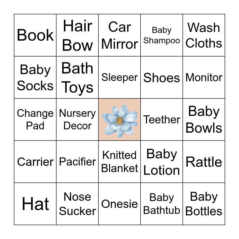 This bingo card has 1 images, a free space and 48 words: Diapers, Baby Bottles, Baby Blanket, Onesie, Pacifier, Baby Wipes, Hair Bow, Sleep Sack, Baby Socks, Stuffed Animal, Bath Toys, Baby Shampoo, Rattle, Baby Lotion, Crib Sheets, Blocks, Sleeper, Teether, Swaddle, Wash Cloths, Nursery Decor, Baby Bathtub, Book, Shoes, Sound Machine, Monitor, Hat, Mittens, Knitted Blanket, Carrier, Diaper Bag, Breast Pump, Stroller, Crib, Nose Sucker, Nail Clippers, Toothbrush, Baby Bowls, Sippy Cups, Diaper Cream, Toy that Plays Songs, Bibs, Walker, Change Pad, Car Mirror, Bath Thermometer, Stacking Toy and Hairbrush.
