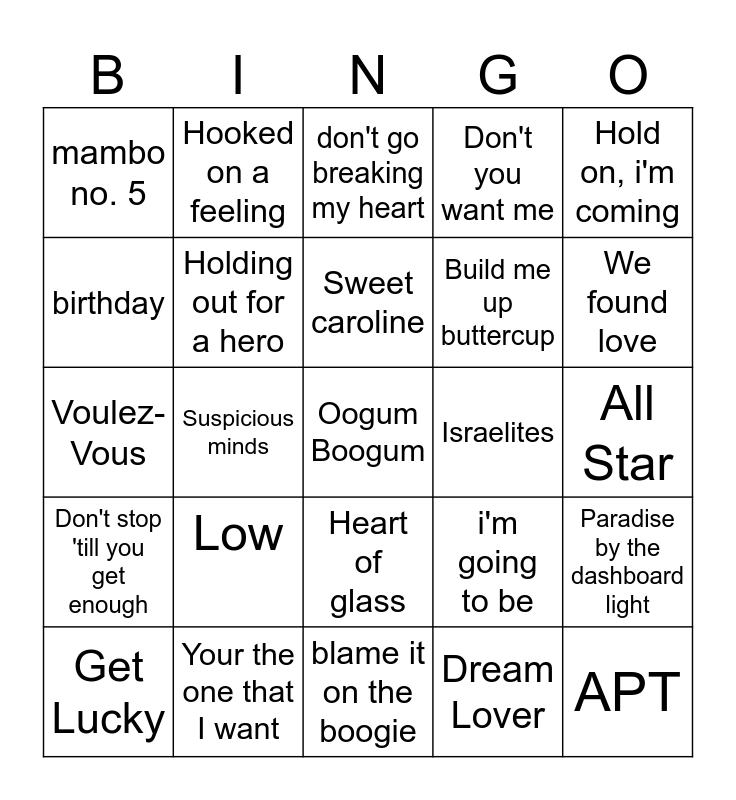 This bingo card has a free space and 34 words: Down Under, Dream Lover, Land of 1000 dances, 9-5, Don't stop 'till you get enough, Holding out for a hero, Hold on, i'm coming, Get Lucky, Hooked on a feeling, Jump in the line, Sweet caroline, don't go breaking my heart, Dancing on my own, Love is strange, Israelites, We found love, Your the one that I want, Voulez-Vous, Low, i'm going to be, Heart of glass, Dancing in the Dark, mambo no. 5, All Star, blame it on the boogie, APT, Don't you want me, Cuando Enamoro, Build me up buttercup, birthday, get lucky, Suspicious minds, Paradise by the dashboard light and Back to black.