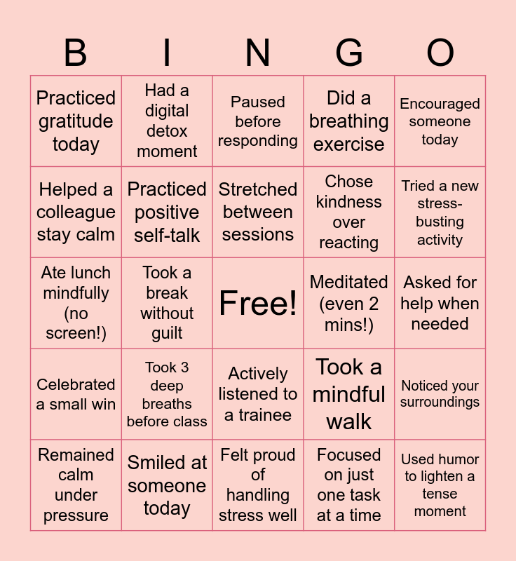 This bingo card has a free space and 24 words: Took 3 deep breaths before class, Smiled at someone today, Stretched between sessions, Remained calm under pressure, Encouraged someone today, Practiced gratitude today, Helped a colleague stay calm, Had a digital detox moment, Meditated (even 2 mins!), Actively listened to a trainee, Chose kindness over reacting, Ate lunch mindfully (no screen!), Took a mindful walk, Noticed your surroundings, Practiced positive self-talk, Focused on just one task at a time, Asked for help when needed, Paused before responding, Tried a new stress-busting activity, Took a break without guilt, Used humor to lighten a tense moment, Celebrated a small win, Did a breathing exercise and Felt proud of handling stress well.