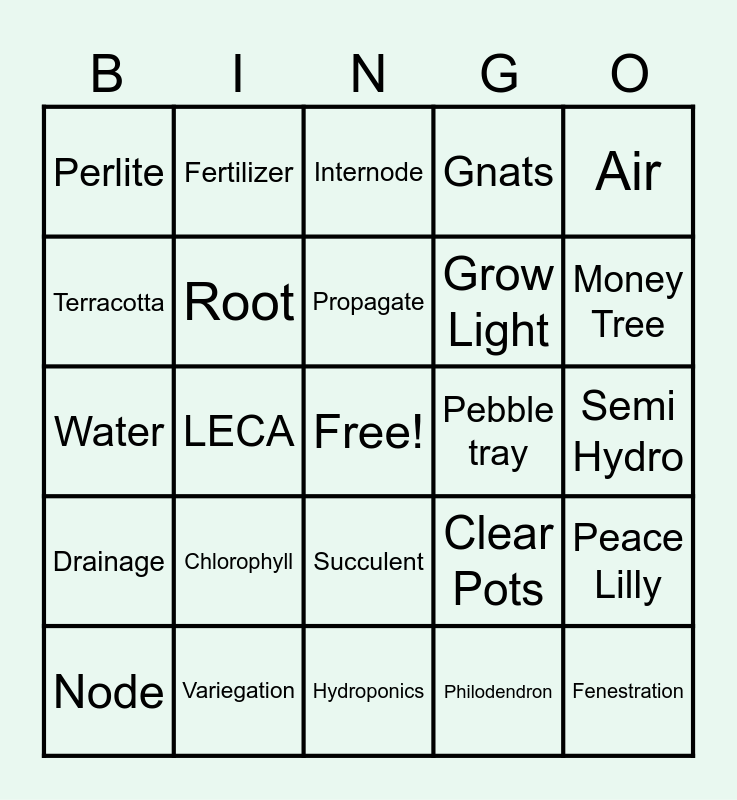 This bingo card has a free space and 34 words: Monstera, Philodendron, Repot, Pothos, Drainage, Root, Air, Node, Fertilizer, Petiole, Propagate, Internode, Neem, Moss Pole, Pebble tray, Money Tree, Variegation, Water, Chlorophyll, Clear Pots, Succulent, Root Rot, Perlite, Semi Hydro, Hydroponics, Fenestration, Gnats, Bottom Watering, Grow Light, Terracotta, Overwatering, LECA, Peace Lilly and Ficus.