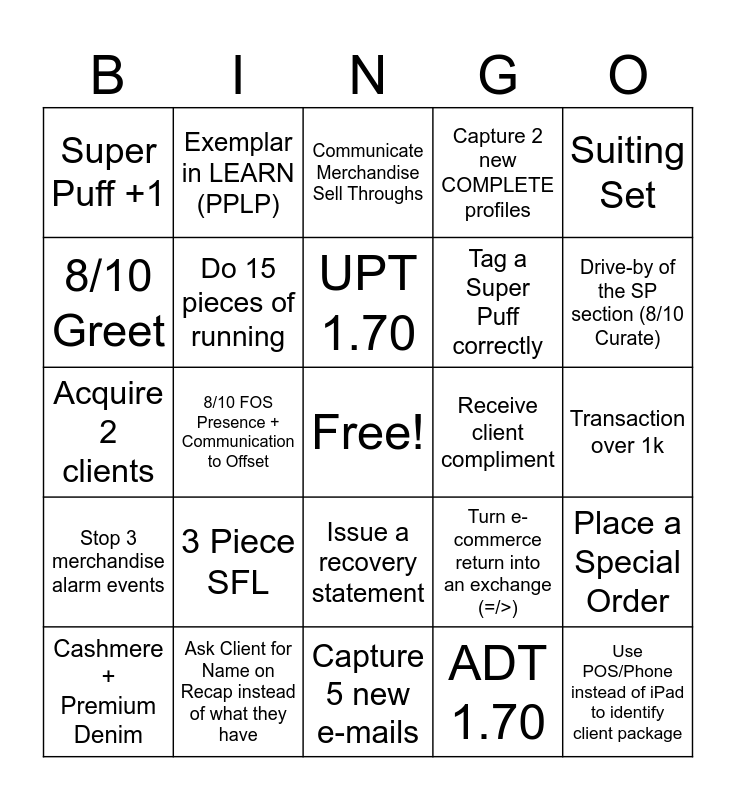 This bingo card has a free space and 24 words: Cashmere + Premium Denim, 3 Piece SFL, UPT 1.70, ADT 1.70, Suiting Set, Super Puff +1, Exemplar in LEARN (PPLP), Communicate Merchandise Sell Throughs, Receive client compliment, Transaction over 1k, Acquire 2 clients, Do 15 pieces of running, Turn e-commerce return into an exchange (=/>), Place a Special Order, 8/10 Greet, Ask Client for Name on Recap instead of what they have, Capture 5 new e-mails, Capture 2 new COMPLETE profiles, Drive-by of the SP section (8/10 Curate), Stop 3 merchandise alarm events, 8/10 FOS Presence + Communication to Offset, Issue a recovery statement, Tag a Super Puff correctly and Use POS/Phone instead of iPad to identify client package.