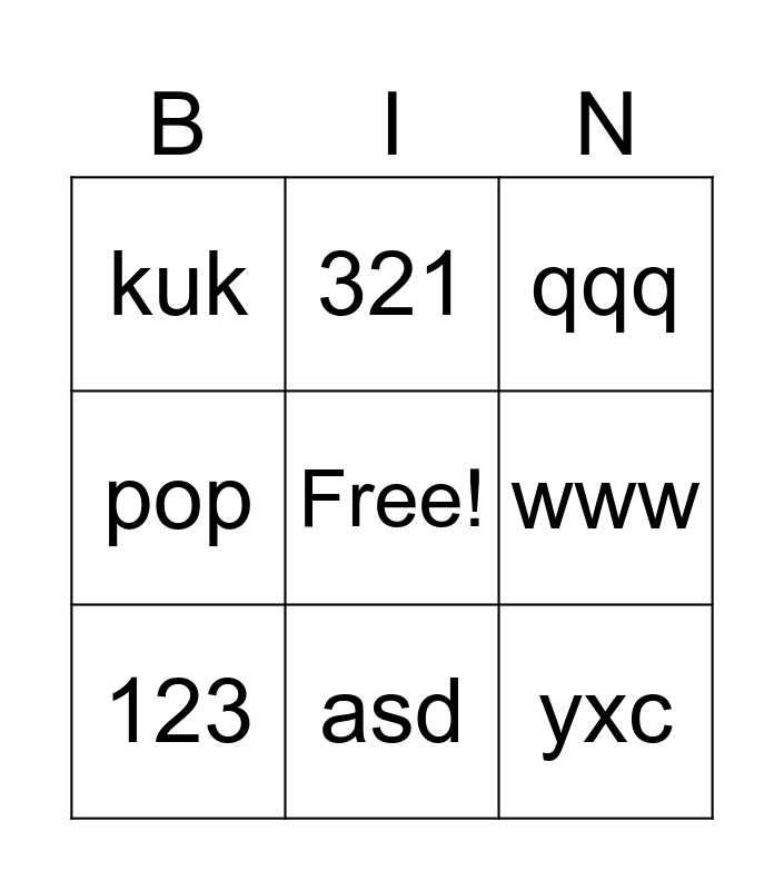 This bingo card has a free space and 11 words: qwe, asd, yxc, 123, 321, qqq, www, eee, pop, kuk and fef.