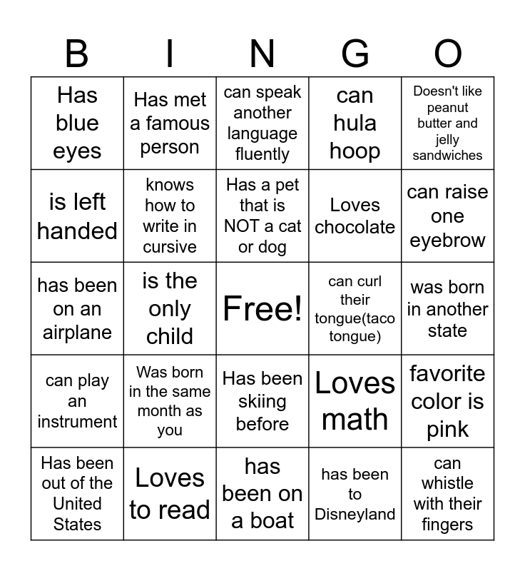 This bingo card has a free space and 24 words: Was born in the same month as you, Loves to read, Has a pet that is NOT a cat or dog, Has been out of the United States, Doesn't like peanut butter and jelly sandwiches, Has blue eyes, is left handed, Has met a famous person, can curl their tongue(taco tongue), Has been skiing before, Loves chocolate, has been on an airplane, Loves math, favorite color is pink, knows how to write in cursive, has been to Disneyland, was born in another state, can speak another language fluently, can raise one eyebrow, is the only child, can whistle with their fingers, can play an instrument, can hula hoop and has been on a boat.
