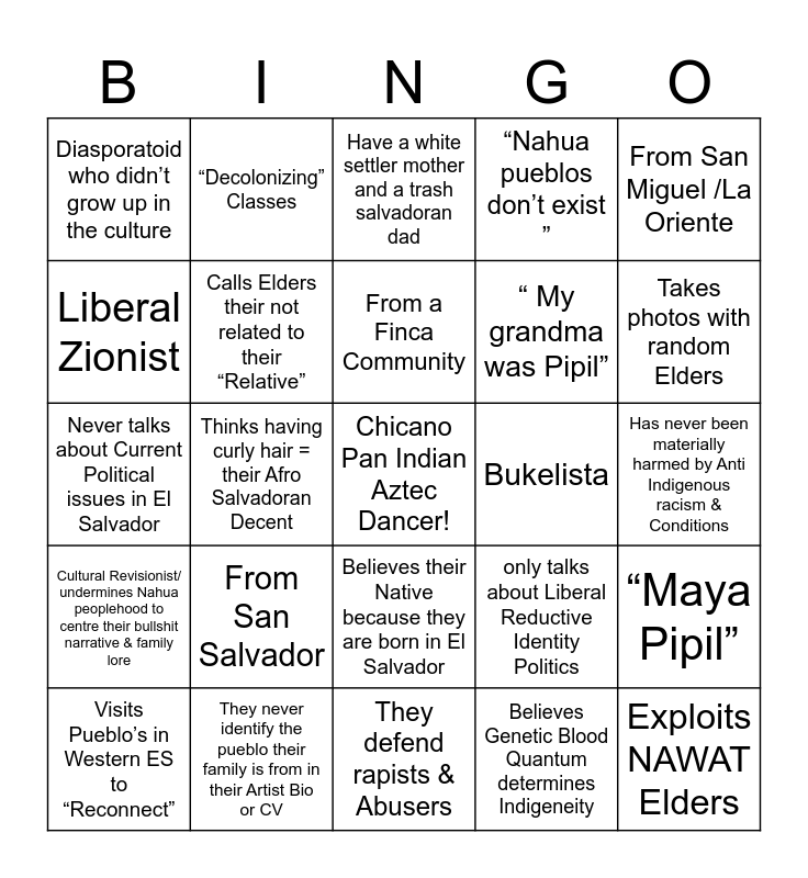 This bingo card has a free space and 24 words: From San Salvador, They never identify the pueblo their family is from in their Artist Bio or CV, From a Finca Community, Visits Pueblo’s in Western ES to “Reconnect”, From San Miguel /La Oriente, Diasporatoid who didn’t grow up in the culture, Liberal Zionist, “Decolonizing” Classes, Bukelista, Believes their Native because they are born in El Salvador, “ My grandma was Pipil”, Never talks about Current Political issues in El Salvador, only talks about Liberal Reductive Identity Politics, “Maya Pipil”, Calls Elders their not related to their “Relative”, Believes Genetic Blood Quantum determines Indigeneity, Has never been materially harmed by Anti Indigenous racism & Conditions, Have a white settler mother and a trash salvadoran dad, Takes photos with random Elders, Thinks having curly hair = their Afro Salvadoran Decent, Exploits NAWAT Elders, Cultural Revisionist/ undermines Nahua peoplehood to centre their bullshit narrative & family lore, “Nahua pueblos don’t exist ” and They defend rapists & Abusers.